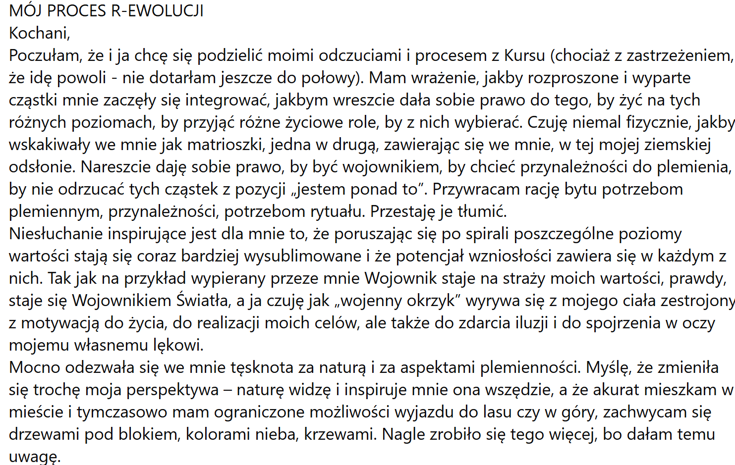 Natomiast na kursie Alchemiczne R-ewolucje odkryłam coś innego, a mianowicie to jak moje przekonania manifestowały się w codziennym życiu, w całym moim życiu, jak mój umysł organizował wszystko tak, żeby mnie chronić oczywiście, żeby pozwolić mi przetrwać i żeby realizować moje przekonania. Na tym kursie zdałam sobie sprawę jak te przekonania, które nosiłam w sobie przez tyle lat urzeczywistniały się w moim życiu. Jak bardzo sprawny, cudownie niesamowity i zdeterminowany jest mój umysł w realizowaniu tych przekonań. W tym kursie odkrywałam to jak na dłoni, odkrywałam na każdym poziomie, że te moje przekonania istnieją, jak się manifestują, odkrywałam tzw. oczywistości. Tak to były jakby oczywistości dla mnie, bo ja w teorii to już dawno wiedziałam, ale ten kurs Alchemiczne Rewolucje pomógł mi to poczuć. Wiele z tych rzeczy, które wiedziałam w teorii i rozumiałam, teraz poczułam dopiero. Poczułam to w pełni, z innej świadomości, ze świadomości Ja Jestem.