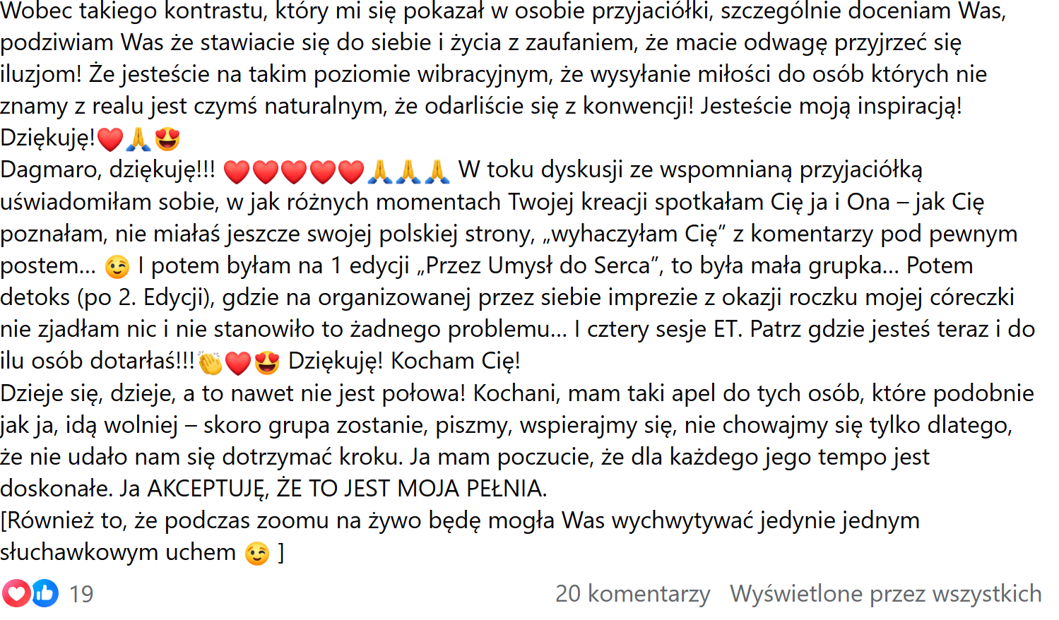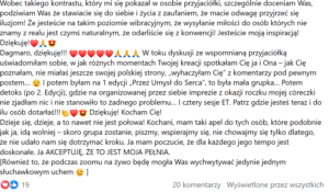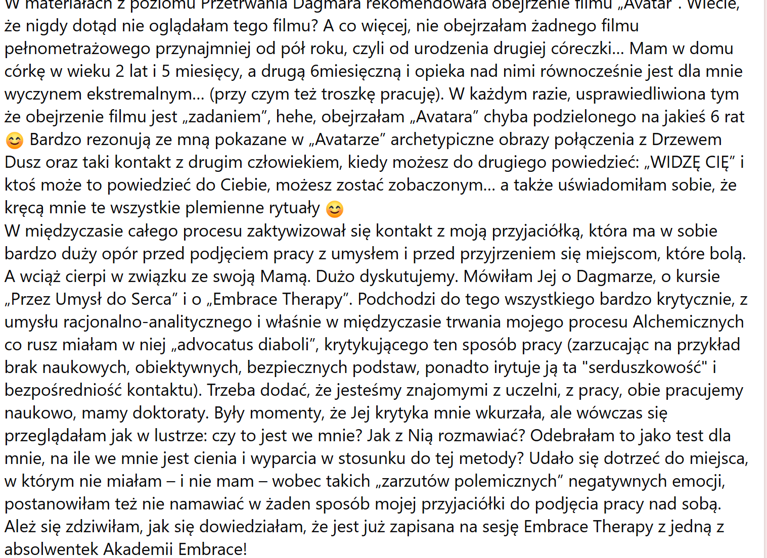 "Chciałam podzielić się z Wami kilkoma słowami na temat kursów, na których byłam u Dagmary Szymańskiej. Jeden z nich to Przez Umysł do Serca. Na tym kursie nauczyłam się, oswoiłam rozpoznałam moje Wewnętrzne Dziecko, mój umysł. Nauczyłam się technik, które pozwalają mi pracować z moim Wewnętrznym Dzieckiem, czyli z moim umysłem. Odkryłam jak mam traktować mój umysł i dowiedziałam się czego tak naprawdę potrzebuje mój umysł.