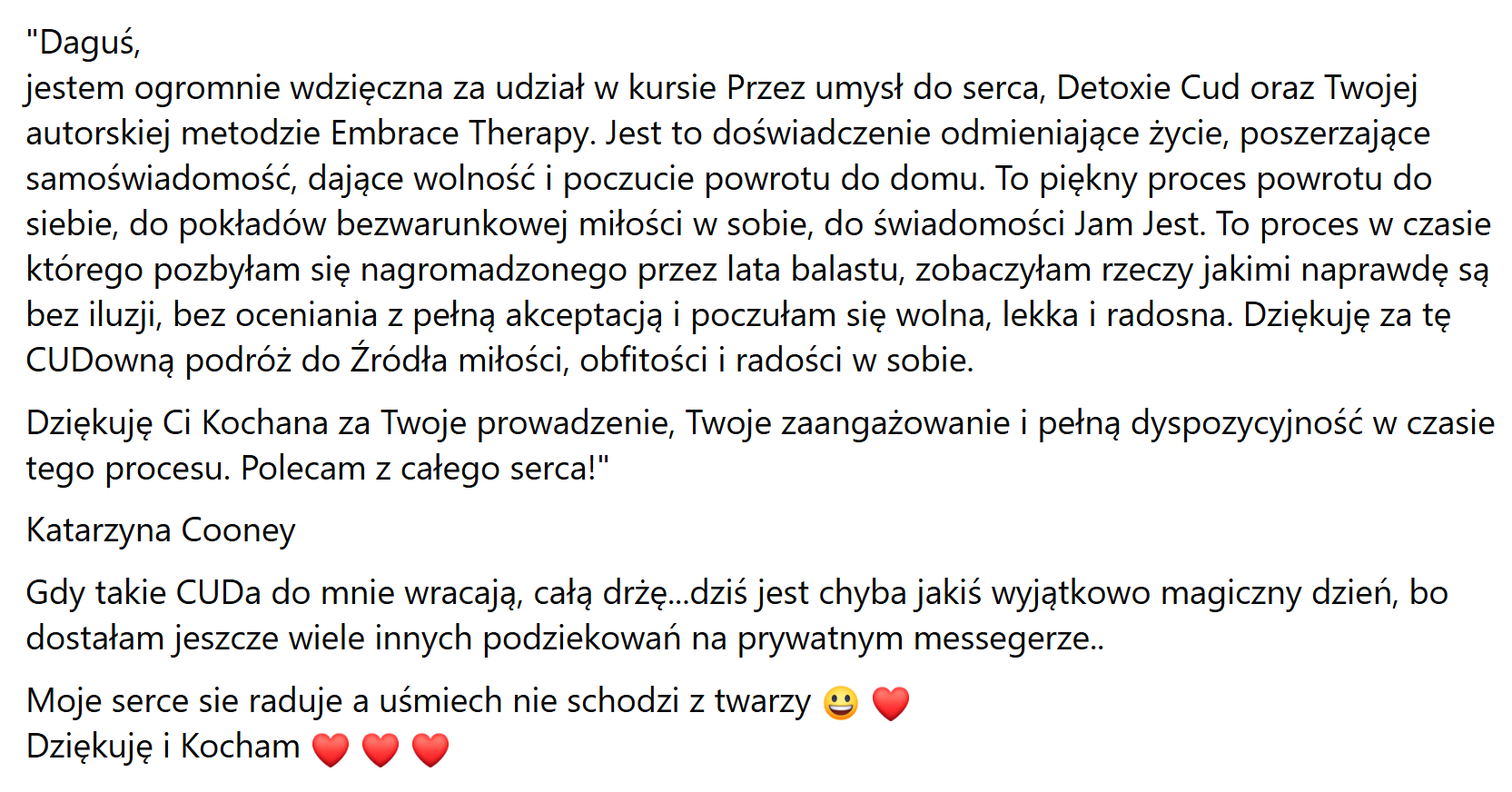 Kochani, kurs "Przez umysł do serca", to piękny proces, który polecam każdemu, kto chce zmienić swoje życie, poznać siebie i żyć w obfitości.