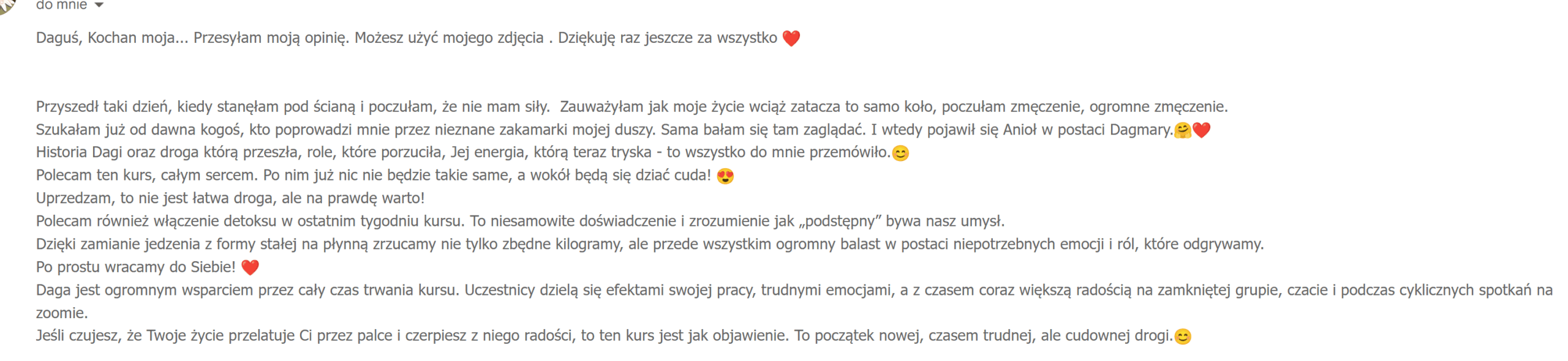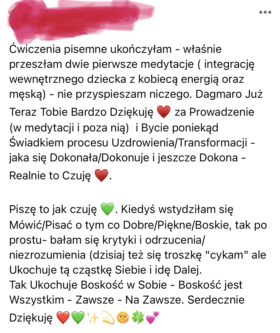 "Kochana Dagmaro, całym sercem dziękuję Tobie, że wskazałaś mi drogę do odkrycia siebie prawdziwej. Dziękuję, że byłaś moim Aniołem, który w sposób subtelny, prawdziwy i pełny miłości prowadził mnie, abym mogła sobie przypomnieć kim naprawdę jestem. Dziękuję za przypomnienie mi, że jestem wszystkim i wszystko jest we mnie. Dziękuję za niezwykłą przygodę i umożliwienie mi doświadczania cudownych chwil z Tobą i z Grupą. Dagmaruś jesteś Wielkim Światłem na mojej drodze. Z Twoich oczu, ust i serca płynie prawda, a cała Ty emanujesz miłością, czuję to całym sercem od momentu, kiedy Ciebie zobaczyłam po raz pierwszy. Dziękuję, że dzielisz się tym wszystkim. Dziękuję, że Jesteś, Kocham Cię..."