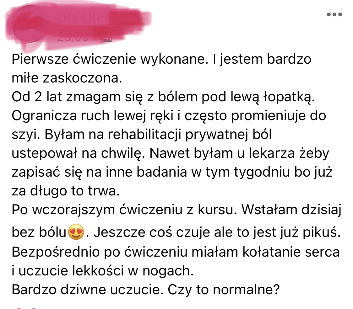 Tego kursu nie da się porównać do żadnych innych ćwiczeń. Jest tu niezwykłe wsparcie grupy, są inspiracje, wzajemna motywacja oraz ogrom wiedzy, mądrości i miłości pochodzącej od prowadzącej kurs Dagmarki. Wspaniale, że tak pięknie dzieli się ona z nami swoim doświadczeniem.