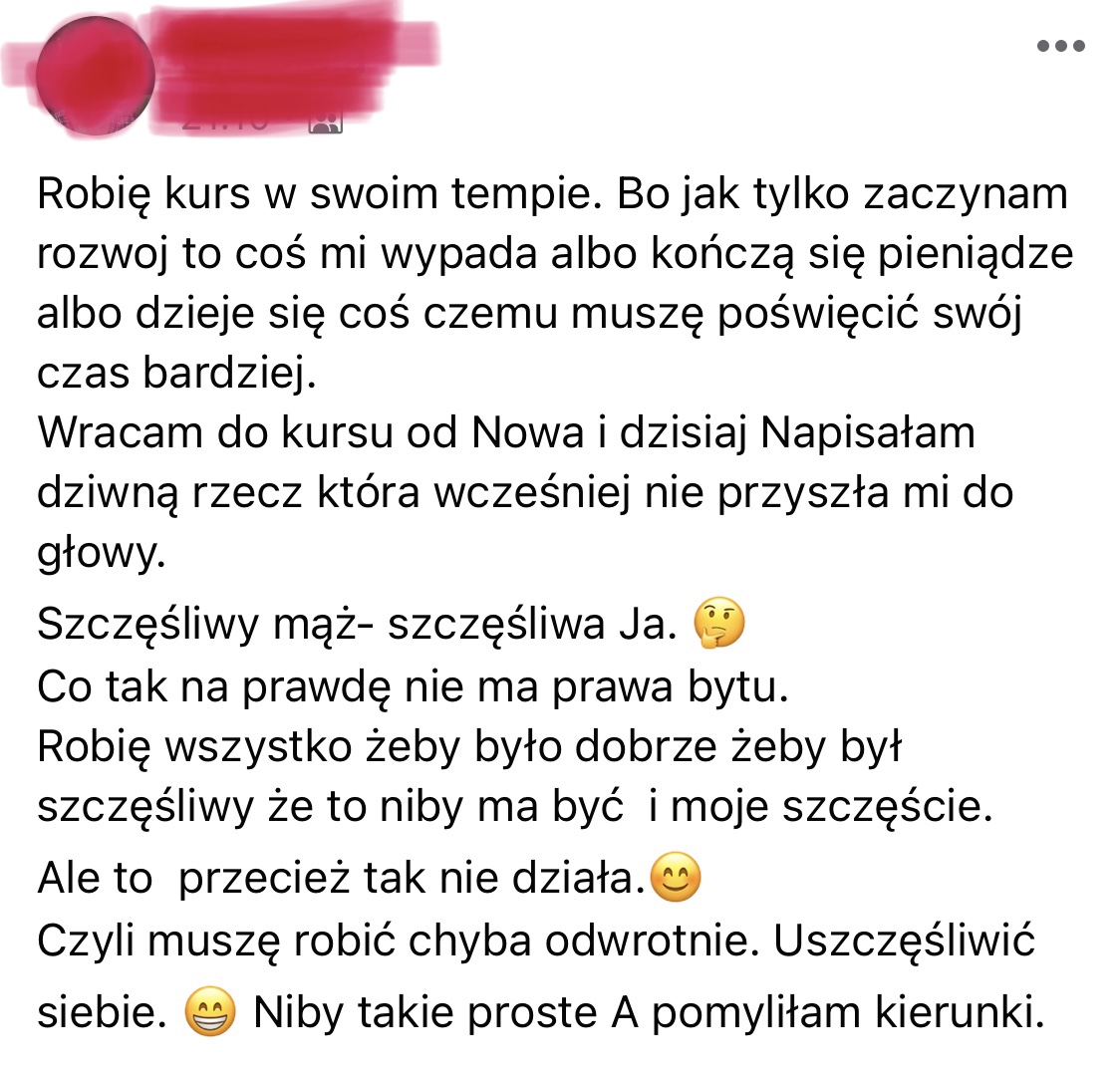 Jakiś czas temu znalazłam się w moim życiu w punkcie, w którym miałam wrażenie, że utknęłam, a dopiero ten kurs stał się dla mnie cudownym drogowskazem na drodze do wyjścia.